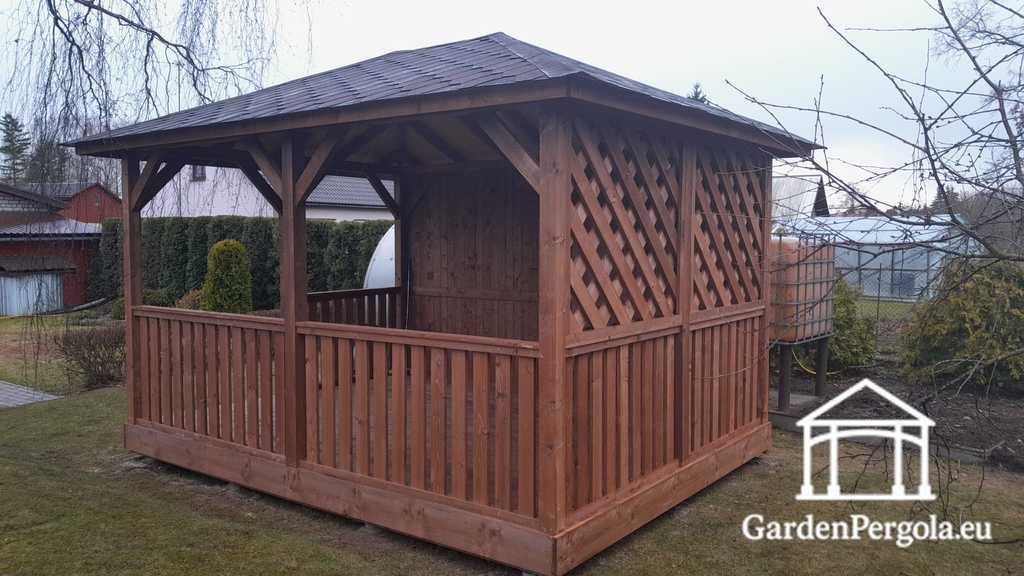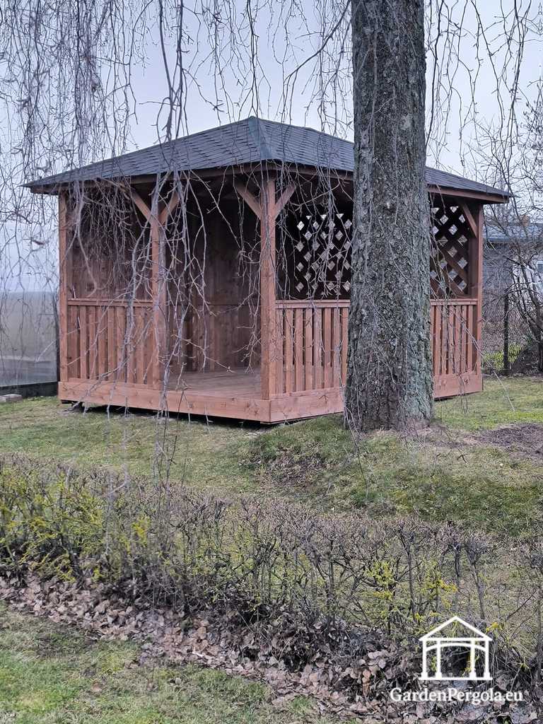 This brown wooden gazebo is thoughtfully designed to combine shelter, privacy, and visual appeal, making it an excellent choice for comfortable outdoor living throughout the entire year. Its balanced structure offers protection from wind and weather while maintaining a bright and welcoming atmosphere.