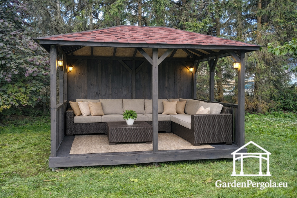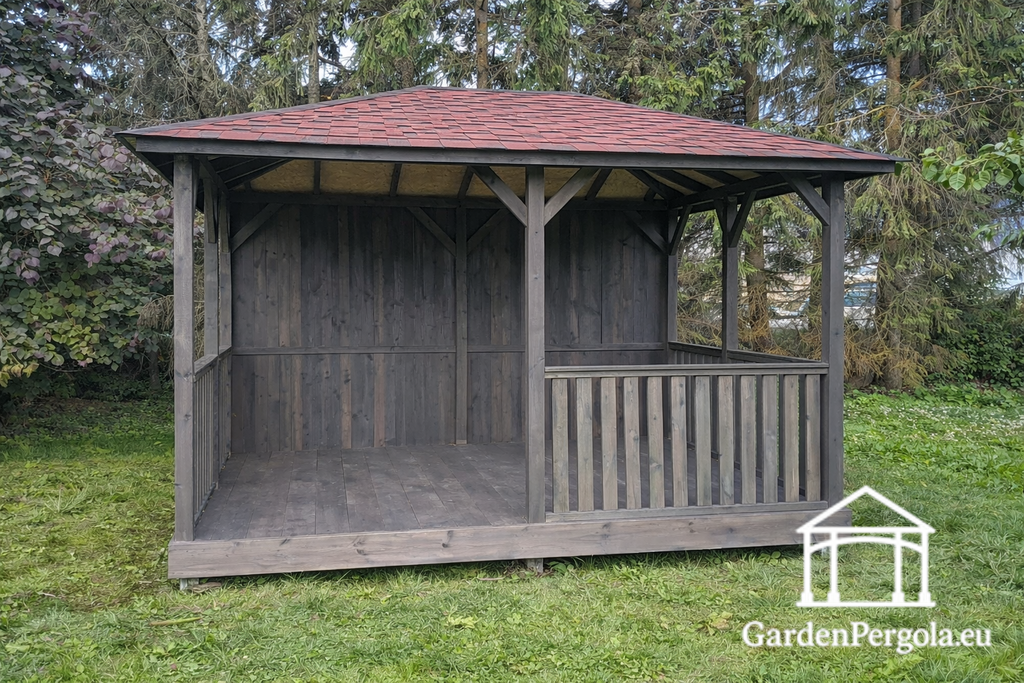 Finished in an elegant dark gray tone, the gazebo delivers a modern yet natural appearance that blends beautifully into both contemporary and traditional landscapes. The contrasting red shingle roof not only adds visual character but also provides dependable protection against sun, rain, and changing weather conditions, making the gazebo suitable for use throughout the year.