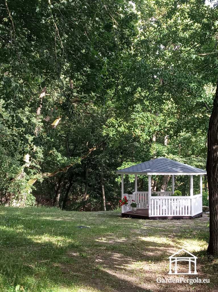 This six-sided white wooden gazebo is designed to bring harmony, balance, and visual appeal to your outdoor space. Featuring an identical hexagonal structure, every side measures 2.1 meters, creating a perfectly symmetrical layout that looks refined from every angle and fits beautifully into landscaped gardens.