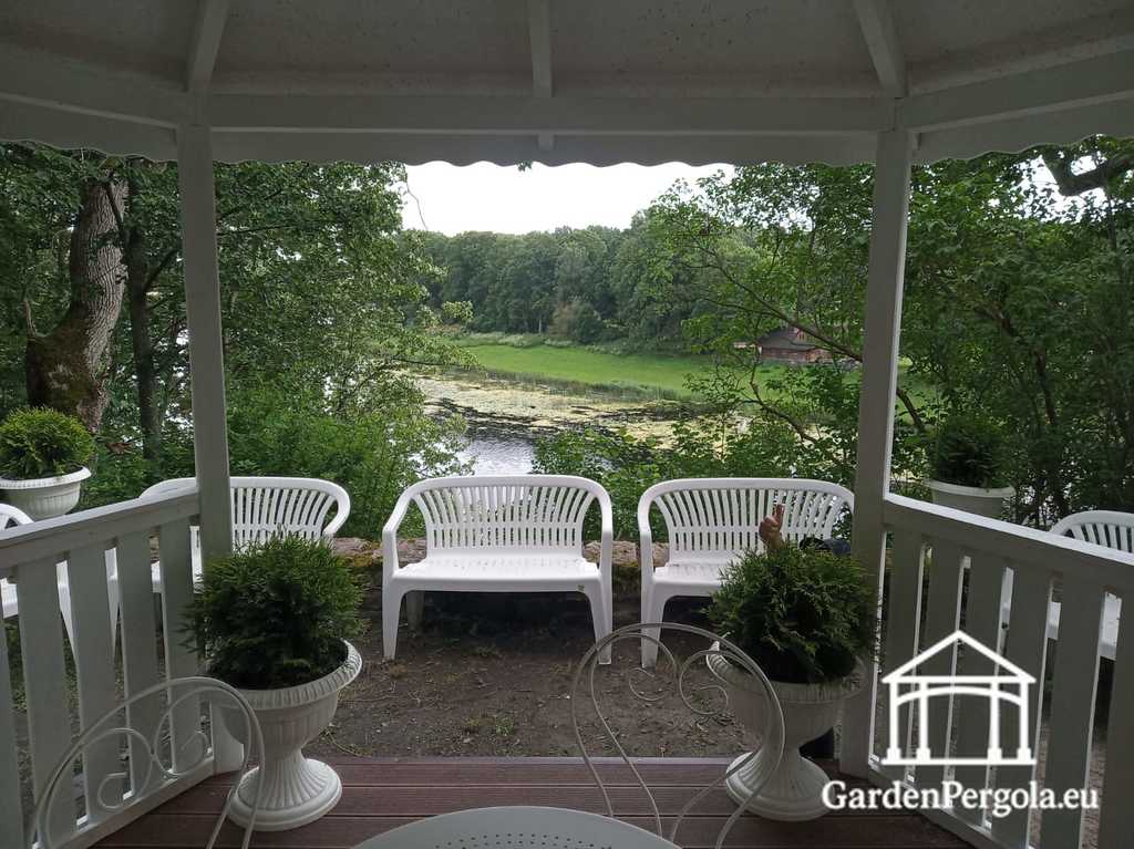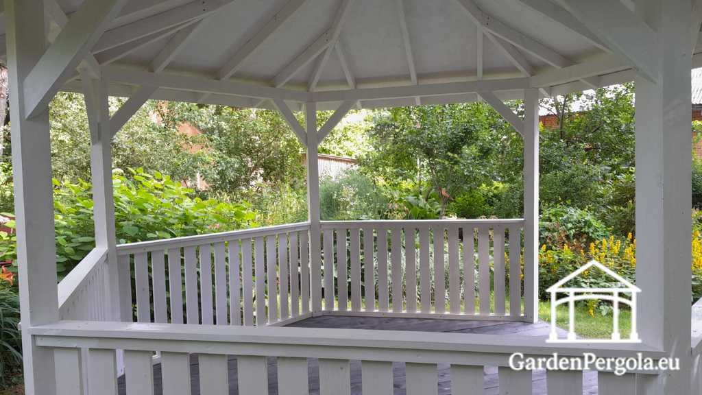 Finished in a clean white tone, this gazebo adds brightness and sophistication to any environment. The surrounding fences provide subtle definition without closing off the space, preserving excellent airflow and unobstructed garden views.