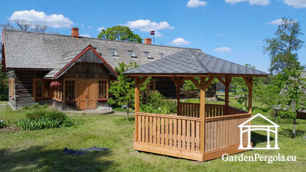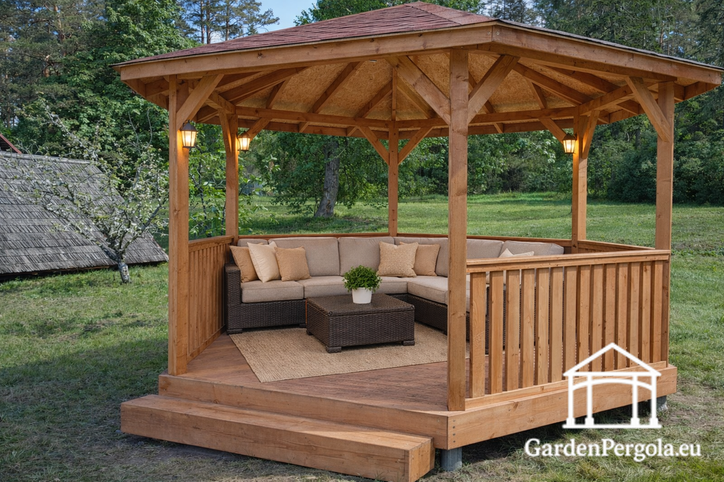 Finished in a warm light brown tone, this gazebo blends naturally with its surroundings and highlights the beauty of real wood. The durable red roof adds visual contrast while providing dependable protection against sun, rain, and changing weather conditions — making the gazebo suitable for use throughout the year.