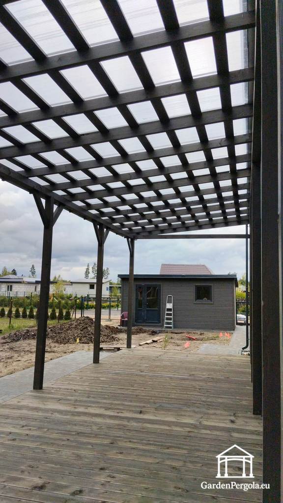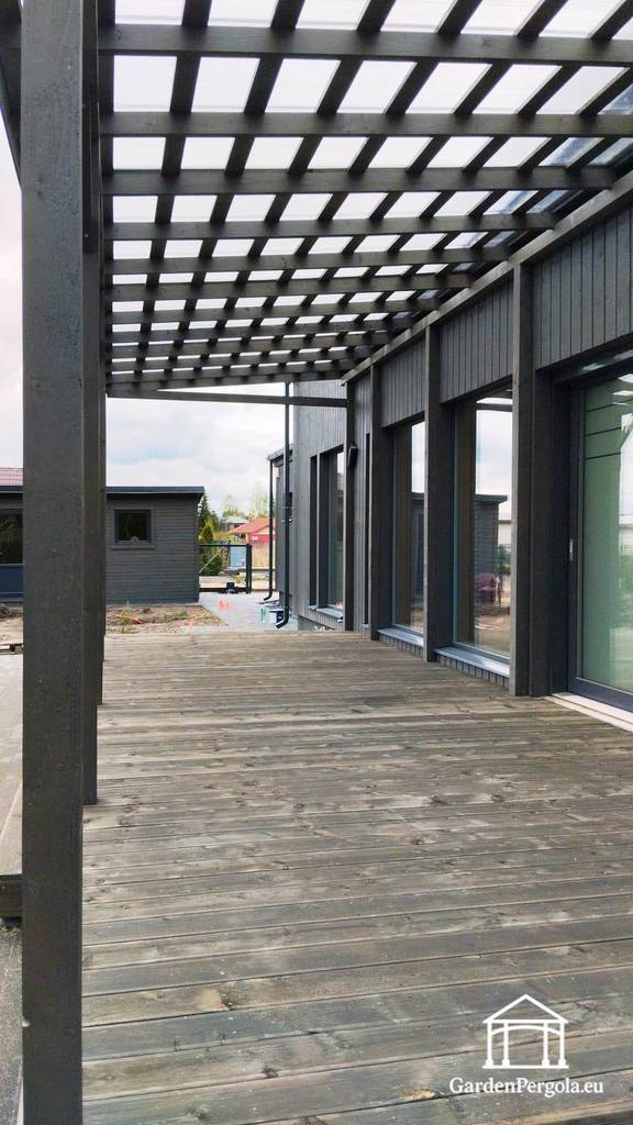 The pergola is topped with a polycarbonate roof, allowing natural light to pass through while protecting the space from rain and excessive sun. This creates a bright yet sheltered terrace environment that can be enjoyed throughout the seasons.