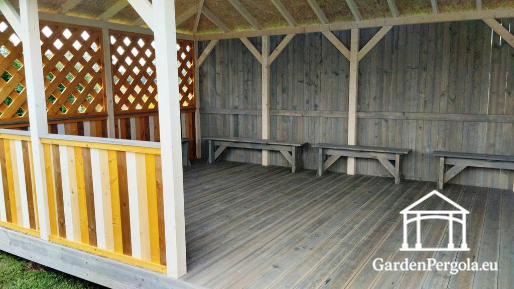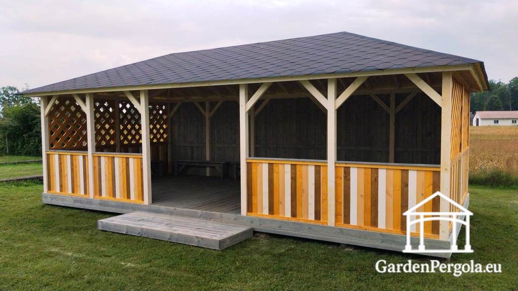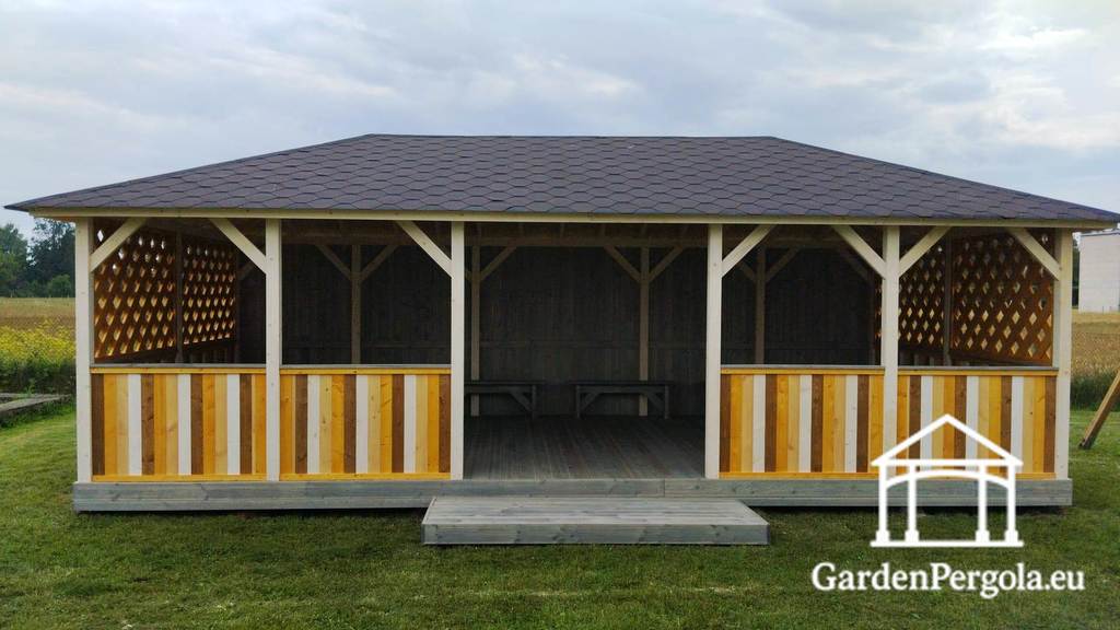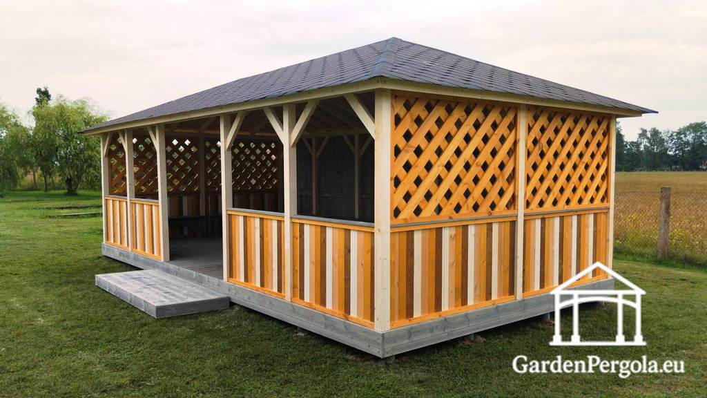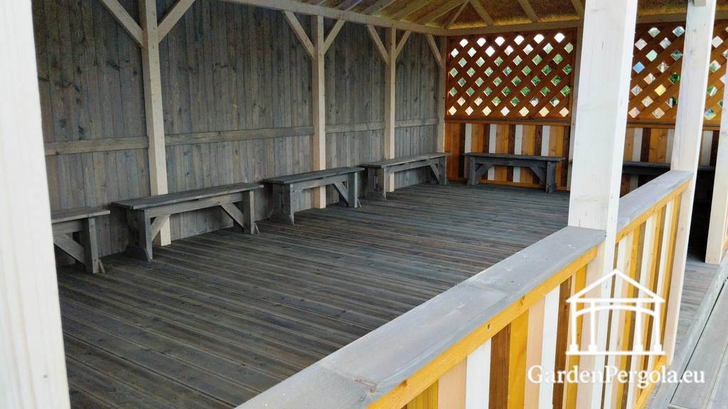 Sāni ir papildināti ar X-veida sieta sienām, kas nodrošina gaisa plūsmu un redzamību, vienlaikus saglabājot aizsargātu vidi. Pilnībā noslēgta aizmugurējā siena nodrošina papildu aizsardzību pret vēju un laikapstākļiem, padarot lapeņu ērtāku grupu aktivitātēm.
