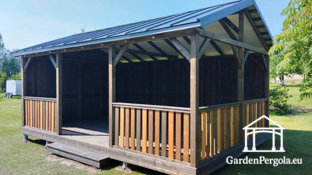 Izgatavota no cietiem 100x100mm koka sijām, lapene nodrošina izcilu stabilitāti un strukturālo uzticamību. Jumta karkass ir pastiprināts ar stiprām 50x100mm karkasa sijām, radot uzticamu konstrukciju, kas paredzēta lietošanai visu gadu.